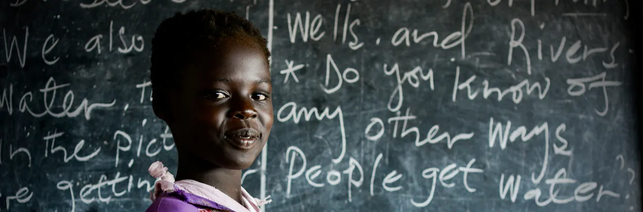 In the Bentiu Protection of Civilians (POC) site in Unity State, South Sudan, nine-year-old Nyapuor carries an empty and battered USAID food tin to sit on at school. She has to bring this tin because there are no seats for her at the school. “I came with my mother to the POC because of the war. I saw so many people wounded and men shooting guns, it was very bad. I feel safe here in the POC and want to keep coming to school. My favourite subject at school is math. I would like to have more text books to read, that would make me even happier.”