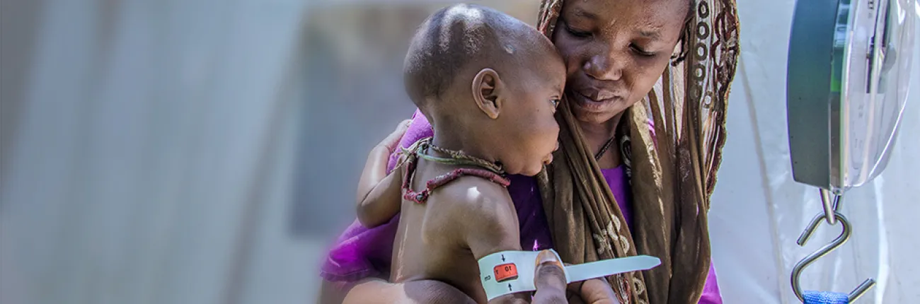 Seven-month-old Umara Bukar is assessed for malnutrition by a UNICEF Nutrition Officer at a UNICEF-supported health clinic at Muna Garage Internally Displaced Persons camp in Borno State, northeast Nigeria. More than 117,000 children with severe acute malnutrition in northeast Nigeria have been admitted to therapeutic feeding programs run by UNICEF and partners.