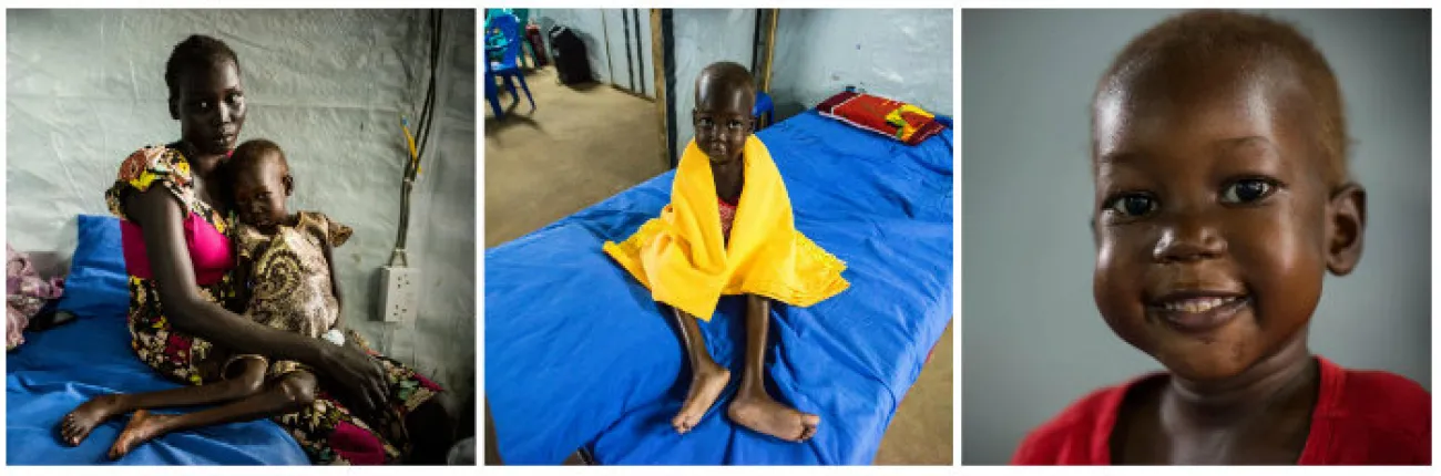 Four-year-old Nyajime Guet was suffering from SAM with medical complications when she was admitted to the UNICEF-supported clinic at the Protection of Civilians (PoC) site in Juba, South Sudan. Weighing just nine kilograms, rather than the 19.5 kilograms a healthy girl of her age and height should weigh, Nyajime was emaciated and near death.