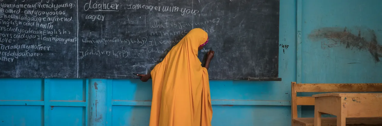 A young girl writes her answers to a question on the chalkboard of her class in her UNICEF-supported primary school, Salaama in Galkayo, Somalia.